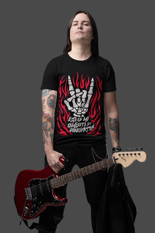 🤘 Diseño Imponente: La imagen de una mano esquelética haciendo el símbolo de los cuernos, rodeada de llamas rojas, refleja la energía y el espíritu del metal en su máxima expresión. El texto "Mi Camiseta de Conciertos" declara tu pasión y compromiso con la música en vivo.